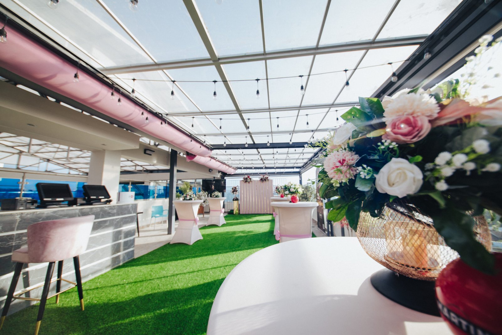 Le rooftop est un espace en hauteur offrant une vue dégagée sur la ville. Semi-ouvert, couvert en toiture mais ouvert sur les côtés, il propose une ambiance aérienne idéale pour les cocktails, afterworks, engagements, dîners en altitude, ou événements élégants en soirée. Il est recommandé surtout pendant la saison sèche en raison de son exposition partielle.