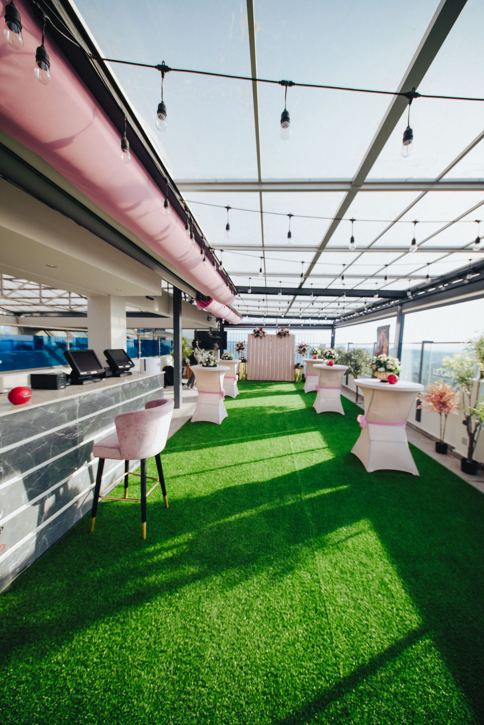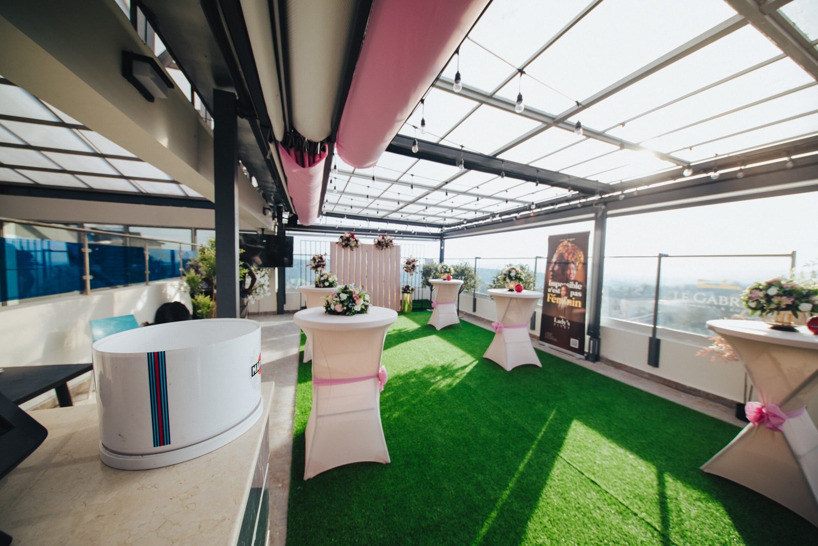 Le rooftop est un espace en hauteur offrant une vue dégagée sur la ville. Semi-ouvert, couvert en toiture mais ouvert sur les côtés, il propose une ambiance aérienne idéale pour les cocktails, afterworks, engagements, dîners en altitude, ou événements élégants en soirée. Il est recommandé surtout pendant la saison sèche en raison de son exposition partielle.